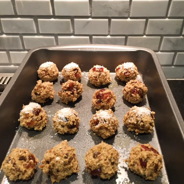 Roll golf ball sized balls and place on baking sheet. Warning: your hands will be covered with almond butter and oats so try not to touch anything in your kitchen. Should make 16-18 balls. Top with coconut and place in the refrigerator for 20-25 minutes before eating.
